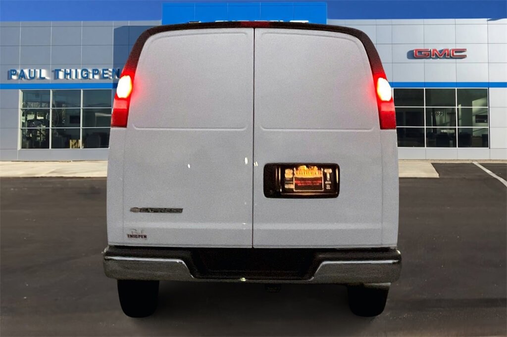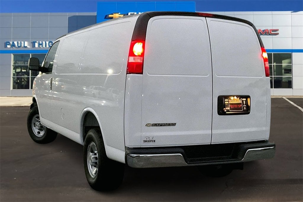 Summit White 2025 Chevrolet Express 2500 Work Van 4.3L V6 RWD Chrome Appearance Package (Chrome Grille and Front & Rear Chrome Bumpers w/Step-Pad), Driver Convenience Package (Cruise Control and Tilt Steering Wheel), Heavy-Duty Trailering Equipment, Preferred Equipment Group 1WT, 16 x 6.5 Steel Wheels, 2 Speakers, 3.42 Rear Axle Ratio, 4-Wheel Disc Brakes, 6-Way Power Driver Seat Adjuster, ABS brakes, Air Conditioning, AM/FM radio, AM/FM Stereo w/MP3 Player, Delay-off headlights, Driver & Front Passenger High-Back Bucket Seats, Driver door bin, Driver's Seat Mounted Armrest, Dual front impact airbags, Dual front side impact airbags, Electronic Stability Control, Engine Cover Console w/Swing-Out Storage Bin, Exterior Parking Camera Rear, Front anti-roll bar, Front Bucket Seats, Front Reclining High-Back Bucket Seats, Front wheel independent suspension, Full-Length Black Rubberized-Vinyl Floor Covering, Fully automatic headlights, Heated door mirrors, Low tire pressure warning, Occupant sensing airbag, Overhead airbag, Passenger cancellable airbag, Passenger door bin, Passenger seat mounted armrest, Power door mirrors, Power steering, Power windows, Reclining Front Bucket Seats w/Inboard Armrests, Single-Zone Manual Air Conditioning, Tachometer, Traction control, Trip computer, Variably intermittent wipers, Vinyl Seat Trim, and Voltmeter.