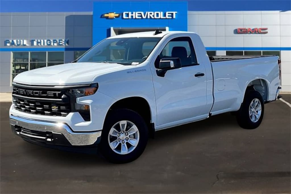 Summit White 2026 Chevrolet Silverado 1500 WT EcoTec3 5.3L V8 RWD Preferred Equipment Group 1WT (3.5 Monochromatic Display Driver Info Center, 4-Way Manual Driver Seat Adjuster, Black (Semi-Gloss) Front Bumper, Black (Semi-Gloss) Rear Bumper, Bluetooth® For Phone, Electronic Cruise Control, Front Frame-Mounted Black Recovery Hooks, HD Rear Vision Camera, Heated Power-Adjustable Outside Mirrors, Inside Rear-View Mirror w/Tilt, Locking Tailgate, Manual Tailgate Function w/No EZ Lift, Manual Tilt Wheel Steering Column, OnStar Services Capable, Power Front Windows w/Driver Express Up/Down, Power Front Windows w/Passenger Express Down, Remote Keyless Entry, Rubberized-Vinyl Floor Covering, SiriusXM Delete, Solar Absorbing Tinted Glass, Standard Tailgate, Teen Driver, Tire Pressure Monitoring System, and Wi-Fi Hot Spot Capable), Standard Suspension Package, Trailering Package (Hitch Guidance), WT Convenience Package (Deep-Tinted Glass and Electric Rear-Window Defogger), WT Safety Package (Front Chrome Bumper, High Gloss Black Mirror Caps, Lane Change Alert w/Side Blind Zone Alert, Perimeter Lighting, Rear Chrome Bumper, Rear Cross Traffic Braking, Rear Pedestrian Alert, and Ultrasonic Front & Rear Park Assist), WT Value Package, 10-Speed Automatic, Jet Black Vinyl, 120-Volt Bed Mounted Power Outlet, 120-Volt Interior Power Outlet, 170 Amp Alternator, 2 Speakers, 2-Speaker Audio System, 220 Amp Alternator, 4-Wheel Disc Brakes, 40/20/40 Front Split Bench Seat, ABS brakes, Air Conditioning, Apple CarPlay/Android Auto, Auto High-beam Headlights, Auto-Locking Rear Differential, Automatic Emergency Braking, Auxiliary External Transmission Oil Cooler, Brake assist, Chevytec Spray-On Black Bedliner, Compass, Delay-off headlights, Driver door bin, Dual front impact airbags, Dual front side impact airbags, Electronic Stability Control, Emergency communication system: OnStar, External Engine Oil Cooler, EZ Lift Power Lock & Release Tailgate, Following Distance Indicator, Forward Collision Alert, Front anti-roll bar, Front Center Armrest w/Storage, Front License Plate Kit, Front Pedestrian Braking, Front reading lights, Front wheel independent suspension, Fully automatic headlights, Heated door mirrors, Illuminated entry, Integrated Trailer Brake Controller, IntelliBeam Automatic High Beam On/Off, Lane Keep Assist w/Lane Departure Warning, Low tire pressure warning, Occupant sensing airbag, Outside temperature display, Overhead airbag, Overhead console, Panic alarm, Passenger door bin, Passenger vanity mirror, Power door mirrors, Power steering, Power windows, Premium audio system: Chevrolet Infotainment 3, Radio data system, Radio: Chevrolet Infotainment 3 System, Rear reading lights, Rear step bumper, Remote keyless entry, Speed control, Speed-sensing steering, Tachometer, Tilt steering wheel, Traction control, Trip computer, Variably intermittent wipers, Vinyl Seat Trim, Voltmeter, Wheels: 17 x 8 Bright Silver Painted Aluminum, and Wheels: 17 x 8 Ultra Silver Painted Steel. 10-Speed Automatic, Jet Black Vinyl. Price includes: $1000 - Bonus Cash. Exp. 11/03/2025 $2000 - Customer Cash. Exp. 11/03/2025
