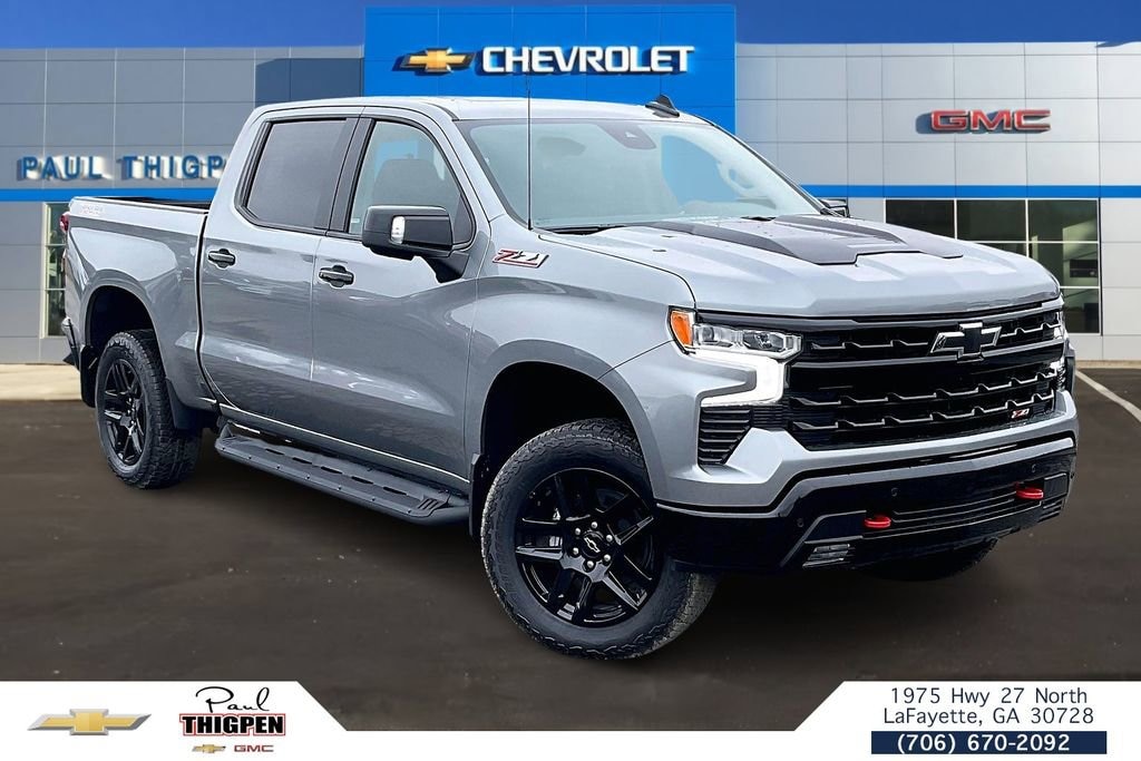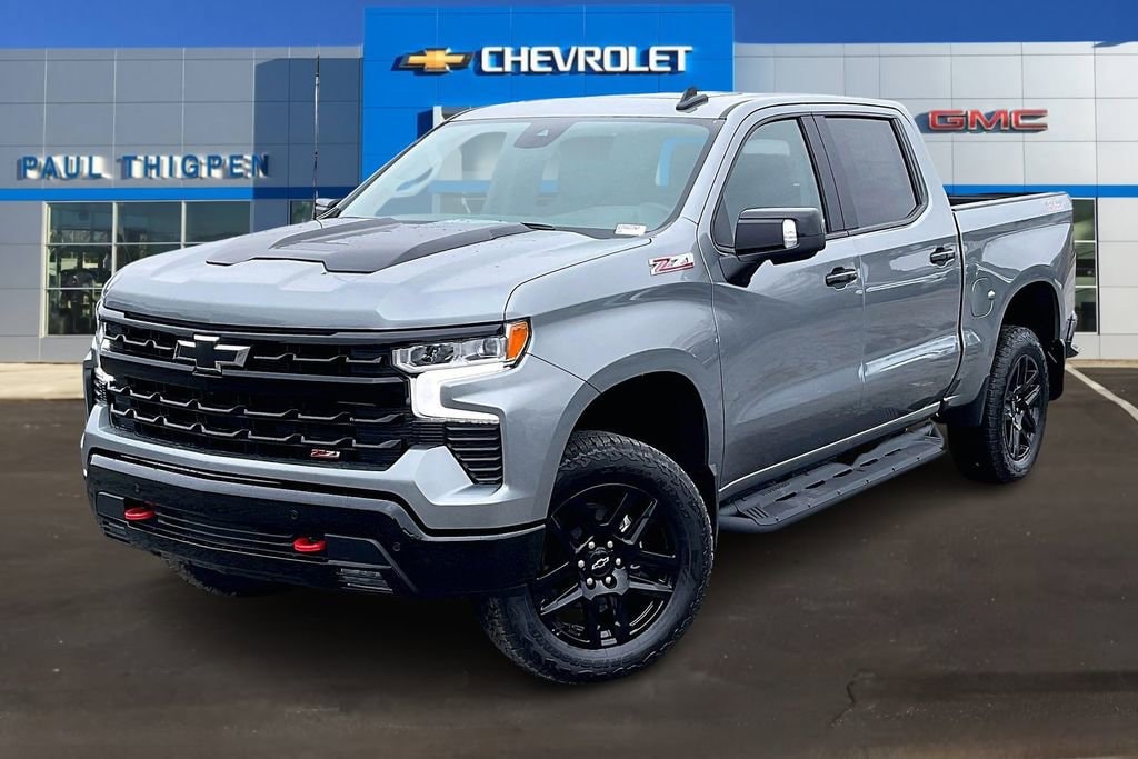 Sterling Gray Metallic 2026 Chevrolet Silverado 1500 LT Trail Boss EcoTec3 5.3L V8 4WD Convenience Package (10-Way Power Driver Seat with Lumbar, 120-Volt Bed Mounted Power Outlet, 120-Volt Interior Power Outlet, Dual Rear USB Ports (charge Only), Dual-Zone Automatic Climate Control, Electric Rear-Window Defogger, Heated Driver and Front Outboard Passenger Seats, Heated Steering Wheel, Keyless Open and Start, LED Cargo Area Lighting, Manual Tilt/Telescoping Steering Column, Remote Vehicle Starter System, Theft Deterrent System (unauthorized Entry), and Wrapped Steering Wheel), Convenience Package II (Hitch Guidance with Hitch View, in-Vehicle Trailering System App, Power Sliding Rear Window with Rear Defogger, Premium Bose 7-Speaker Sound System, and Universal Home Remote), Leather Package (Leather-Appointed Front Seat Trim), LT Trail Boss Premium Package (Power Tailgate), Preferred Equipment Group 2LT (12.3 Multicolor Reconfigurable Digital Display, 40/20/40 Front Split-Bench Seat, 6-Speaker Audio System, All-Weather Floor Liner, Auto-Locking Rear Differential, Bluetooth® For Phone, Cloth Seat Trim, Color-Keyed Carpeting Floor Covering, Deep-Tinted Glass, Electronic Cruise Control, EZ Lift Power Lock and Release Tailgate, Front LED Fog Lamps, HD Rear Vision Camera, Heated Power-Adjustable Outside Mirrors, High Gloss Black Mirror Caps, Inside Rearview Mirror with Tilt, Integrated Trailer Brake Controller, OnStar Services Capable, Performance Red Recovery Hooks, Power Front Windows with Driver Express Up/Down, Power Front Windows with Passenger Express Down, Power Rear Windows with Express Down, Rear 60/40 Folding Bench Seat (folds Up), SiriusXM with 360L Trial Subscription, Standard Tailgate, Steering Wheel Audio Controls, Teen Driver, Tire Pressure Monitoring System, Wheels: 20 x 9 High Gloss Black Painted Aluminum, and Wi-Fi Hot Spot Capable), Protection Package (Chevytec Spray-on Black Bedliner and Rear Wheelhouse Liners), Safety Package (HD Surround Vision, Perimeter Lighting, Rear Cross Traffic Braking, Rear Pedestrian Alert, Trailer Camera Provisions, Trailer Side Blind Zone Alert, and Ultrasonic Front and Rear Park Assist), Suspension Package (Heavy-Duty Air Filter and Hill Descent Control), Trailering Package (Hitch Guidance), Up-Level Rear Seat with Storage Package, 10-Speed Automatic, 4WD, Black Leather, 170 Amp Alternator, 2 USB Data Ports, 220 Amp Alternator, 4-Wheel Disc Brakes, 6 Speakers, ABS brakes, Adaptive Cruise Control, Air Conditioning, Alloy wheels, AM/FM radio: SiriusXM with 360L, Apple CarPlay/Android Auto, Auto High-beam Headlights, Automatic Emergency Braking, Automatic temperature control, Auxiliary External Transmission Oil Cooler, Brake assist, Compass, Delay-off headlights, Driver door bin, Driver vanity mirror, Dual Exhaust with Polished Outlets, Dual front impact airbags, Dual front side impact airbags, Electronic Stability Control, Electronic Transmission Range Selector Shifter, Emergency communication system: OnStar, External Engine Oil Cooler, Floor Mounted Center Console, Following Distance Indicator, Forward Collision Alert, Front anti-roll bar, Front Bucket Seats, Front Center Armrest w/Storage, Front dual zone A/C, Front fog lights, Front Pedestrian Braking, Front reading lights, Front wheel independent suspension, Fully automatic headlights, Heated door mirrors, Heated front seats, Heated steering wheel, Illuminated entry, IntelliBeam Automatic High Beam on/Off, Lane Keep Assist with Lane Departure Warning, Low tire pressure warning, Molded Black Splash Guards, Occupant sensing airbag, Off-Road Assist Steps, Outside temperature display, Overhead airbag, Overhead console, Panic alarm, Passenger door bin, Passenger vanity mirror, Power door mirrors, Power driver seat, Power steering, Power Sunroof, Power windows, Premium audio system: Che Price includes: $1500 - Bonus Cash. Exp. 03/31/2026 $3250 - Customer Cash. Exp. 03/31/2026 $4008 - Supp